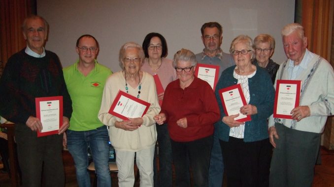 Zwei Jahre nach der großen Ehrungszeremonie im 40jährigen Jubiläumsjahr konnten erneut zahlreiche Mitglieder für langjährige Vereinstreue geehrt und ausgezeichnet werden. Dies waren: für 40jährige Mitgliedschaft Gerhard Fehninger, Irene Koch, Lotte Krüger, Irma Lang, Theresia und Arthur Löffler, Walburga und Franz Schmälze, Rosemarie Weiss, Anneliese und Heinrich Zeis, Rudi Rapp, Karl Reichert, Hildegard Thomé und Anni Stöhr.