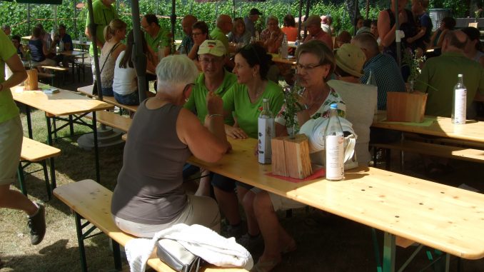 Es war für die beiden Vorsetzenden des Schwarzwaldvereins, Albert Bohnert und Claudia Wilhelm, sicherlich eine Freude, dass einige Schwarzwaldvereine aus dem Bezirk Hornisgrinde ihre Sonntagswanderung mit dem Besuch des Zwei-Tage-Festes verbanden: die Wanderfreunde aus Achern, Bühl, Bühlertal und die “Yburg” zählten mit zu den Gästen, die bei den hochsommerlichen Temperaturen in erster Linie die Plätze im Schatten bevorzugten. Viele Gäste zogen diesen “Non-Stop-Zubringerdienst” dem schweißtreibenden Anmarsch zum Fest vor – vor allem am Sonntag war ein andauerndes “Kommen und Gehen” festzustellen. Vereinschef Albert Bohnert zeigte sich besonders zufrieden ob der Mitarbeit der engagierten Mitglieder, wobei er auch lobende Worte für den tatkräftigen Einsatz rund um den Auf- und Abbau fand. Und weil es der Wettergott einfach fast zu gut meinte, hielt der Besucherandrang erfreulicherweise auch am Sonntag bis in die Abendstunden hinein an: die gesamte Vereinsführung um den Vorsitzenden Albert Bohnert und seine Stellvertreterin Claudia Wilhelm (auf unserem Bild am vorderen Tisch) hatte demnach allen Anlass, von einer gelungenen Festveranstaltung berichten zu können. Zwischen den Sonnenschirmen hindurch ist der Weitblick bis hinein in die Rheinebene, die zur Besonderheit des herrlichen Festplatzes zählt, erkennbar.