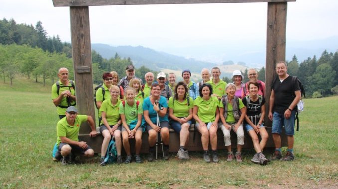 Dies ließen sich die 25 Wanderer , darunter 3 Gäste, nicht zweimal sagen und so ging es nach der Begrüßung von Claudia bei der Tourist-Information Oberhamersbach um 10 Uhr los. Am Danises Hofladen war schon die erste Gelegenheit sich zu stärken. Aber es war zu früh . Als uns dann eine Bank mit großem Vesperbrett und Mostkrug den Beginn des Vesperwegs zeigte, hielt ich eine kurze Erklärung warum dieser Weg so heißt. Der Vesperweg besteht erst seit 2017 ist 14,5 km lang und hat einen Aufstieg von 490 m. Zu Verdanken ist es unteranderem Stefan Lehmann, ein Kettensägekünstler, und seinen Bauhofkollegen, die diesen Wanderweg so schön und abwechslungsreich gestaltet haben. Nun waren alle gespannt was uns schönes erwartet. Nach einem steilen Anstieg sahen wir einen 30 Meter langen Baumstamm. Er bot uns verschiedene Sitzmöglichkeiten an, die wir gerne nutzten und die schöne Aussicht ins Tal genossen. Claudia hatte Mühe alle wieder aus ihren Sitzgelegenheiten hoch zu bekommen. Aber es half ja nix und so marschierten wir weiter. Als wir an einem Hochsitz stoppten , hielt Helmut auch eine kurze Rede über den Ort Oberhamersbach und wie es früher da mal zuging. Anschließend konnten wir uns an einem Brunnenhisli Erfrischungen kaufen. Aber nur alkoholfrei. Das wurde dann nicht so in Anspruch genommen. Wenn vielleicht Schnäpsle drin gestanden wären……hätte bestimmt der eine oder andere was getrunken. Die nächste Station war „….hock mol uf de Arsch..“ schöne Ärschle – Hocker. Wieder ein tolles Plätzchen zum Verweilen. Weiter ging es vorbei an einer Sternwarte sowie ein großer Holzbilderrahmen. Da entstand dann ein gemeinsames Foto von unserer Gruppe. Jetzt kam ja das Highlight „ Das Schmusehisli“. Unter den Wanderern war schnell ein Paar gefunden die sich bereiterklärten uns dies vorzuführen. Wir erfuhren das es ursprünglich ein Strandkorb werden sollte und das klappte dann nicht und kurzerhand wurde ein Häusle drum rum gebaut und liebevoll gestaltet. Nun ging es wieder weiter vorbei an der Kreuzsattelhütte. Da unser Magen schon zu knurren anfing , marschierten wir zielstrebig zum Harkhof , um dort unsere Mittagspause einzulegen. Mit Hausmacher Spezialitäten ließen wir uns verwöhnen . Anschließend wanderten wir gut gestärkt zu den drei großen, hölzernen Stühlen oberhalb vom Harkhof. . Manche trauten sich die Stühle hochzuklettern um sich zu Thronen. Nun ging es steil bergab. Unser Helmut hat aber wie immer die Augen überall und konnte uns einen alternativen Weg zeigen, die manche in Anspruch nahmen. Von weitem sahen wir schon die Hollywoodschaukel, gleich wurde sie von Michael, Rüdiger und Wolfgang in Beschlag genommen. Der Pavillon auf dem „Köpfle“ bot uns eine letzte Möglichkeit die Aussicht auf Oberhamersbach in vollen Zügen zu genießen. Am Parkplatz angekommen bedankte sich Brigitte für die schöne Traumtour. Unseren Abschluss machten wir dann beim Stigler in Ulm und ließen den Tag mit Schnitzel und Bier ausklingen. Ein Dankeschön geht an Konrad Burkhard, der ursprünglich diese Tour entdeckt hat.