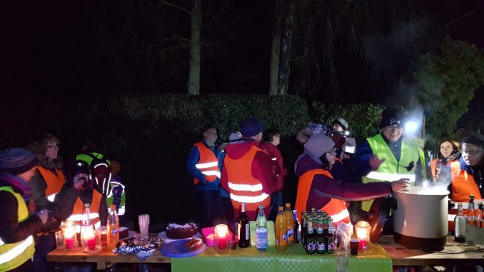 Wir trafen uns um 17.30 Uhr am Lenderparkplatz und fuhren in Fahrgemeinschaften nach Sasbachried zum Gasthaus Wagen. Von dort ging die Wanderung los. Ausgerüstet mit Stirnlampen und Warnwesten konnten wir 23 Wanderer, darunter 2 Gäste sowie 2 Kinder begrüßen. Wir liefen in Richtung Sportplatz nach Walzfeld. Leider war das Wetter nicht auf unserer Seite. Der Vollmond hat sich hinter den Wolken versteckt. In der Nähe vom Klärwerk an einer Brücke machten wir die erste Rast. Glühten mal vor mit Blutwurz, Tresterschnaps und Willi….jetzt wurde uns schon warm. Und weiter marschierten wir am Damm entlang im Nebel rum, aber die Fackeln leuchteten uns den Weg. Nach ca. 1 Stunde Gehzeit hatten wir unser Zwischenstop in Breithurst erreicht. In einem privaten Anwesen stärkten wir uns mit Glühwein, Bier und Fanta , sowie mit verschiedenen Kuchensorten.