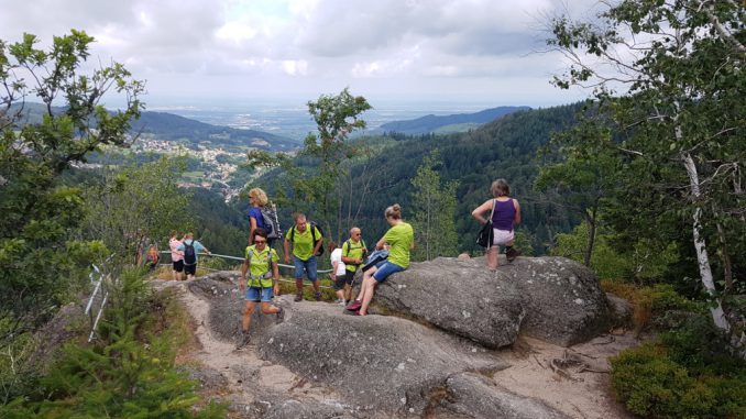 Die mit vielen schönen Aussichten gespickte Wanderung wollten sich 13 Wanderfreunde nicht entgehen lassen. Bei gutem Wetter starteten wir von der Touristen-Info in Bühlertal aus auf einem Zuweg zum Parkplatz beim Wiedenbach. Dieser ist zugleich auch der Einstieg zu den Gertelbach-Wasserfällen. Schmale Pfade, viele Treppen und Brücken machen den mühevollen Aufstieg zum Erlebnis. Der Gertelbach entspringt westlich der Schwarzwaldhochstraße und mündet nach 2,5 km in den kleineren Wiedenbach. Er überwindet dabei 330 Höhenmeter. Im steilsten Abschnitt stürzt der Bach kaskadenartig 220 m tief in etwa 15 Fallstufen von 2 bis 6m Höhe. Bald hatten wir unseren ersten Aussichtspunkt, den Wiedenfelsen, erreicht. Bei einer kleinen Pause konnten wir den Ausblick über Bühlertal und die Rheinebene genießen. Auch die Hertahütte war schon in Sichtweite. Auf dem Paradiesweg, der seinem Namen alle Ehre macht, erreichten wir dann die imposanten Falkenfelsen. Sie sind eine etwa 60m hohe Granit-Felsformation und als Naturdenkmal ausgewiesen. Mehrere Kletterrouten befinden sich hier. Die Hertahütte war unser nächster Aussichtspunkt. Trotz trübem Wetter konnten wir bis zu den Vogesen sehen. Der Weiterweg führte uns dann zur Kohlbergwiese zur verdienten Mittagspause. Frisch gestärkt wanderten wir dann auf schmalen Pfaden zum Schägenfelsen, einem weiteren Aussichtsfelsen mit herrlichem Blick über Bühlertal und die Rheinebene. Vorbei am Schwanenwasen erreichten wir dann den Ortsteil Büchelbach. Nach einer kurzen Trinkpause bei einem Arbeitskollegen von Marina war unser nächstes Ziel die Emil-Kern-Hütte. Auch hier wieder wunderschöne Aussichten in alle Richtungen. Danach machten wir uns dann an den Abstieg über den Engelssteig, wobei wir die schwierigen Kletterpassagen ausließen. Trotzdem war der Weg schwierig zu gehen. Nach 18km und 700 Hm erreichten wir schließlich wieder unseren Ausgangspunkt.
