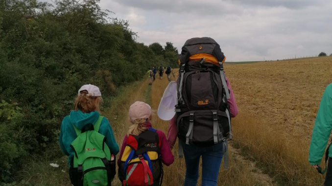 Vier Familien trafen sich am ersten Augustwochenende zu früher Stunde, um zur Burg Neuleiningen zu fahren. Dort angekommen mussten wir feststellen, daß der Himmel recht bewölkt und von der Sonne noch nicht sehr viel zu sehen war. Das hielt uns nicht davon ab unsere Rucksäcke zu schultern und so ging es zunächst oberhalb des Eckbachtals mit herrlichen Tief- und Weitblicken Richtung Nackterhof.