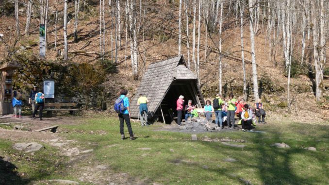 Der Weg führte uns sanft bergauf und wir hatten einen guten Blick über Gutach, bis uns der Wald die Sicht nahm. Nach ca. 30 min. erreichten wir die „Alte Kameraden Hütte“. Hier nutzten einige die Gelegenheit, die Jäckchen auszuziehen, da es beim Hochwandern schon recht warm wurde. Nach einer weiteren Stunde erreichten wir auf Waldwegen den Vögelestein. Er ist mit 607 m die höchste Erhebung auf der rechten Talseite im Gutacher Bereich. Auch ist er der Namensgeber der Gutacher Narrenfigur „Johlia vom Vögelestei“. Helmut erzählte uns die Sage, die sich um den Vögelestein rankt.