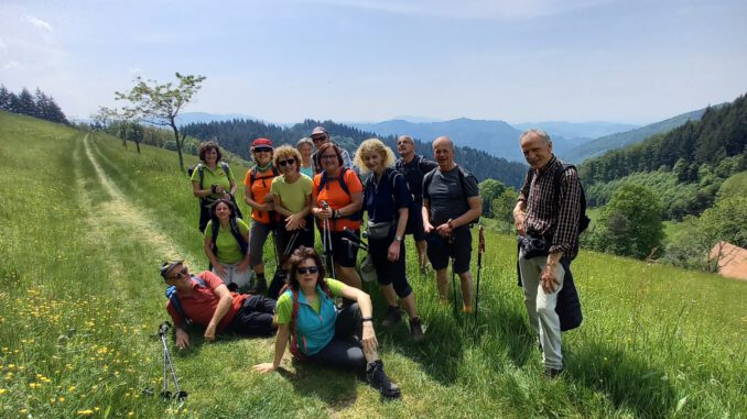 11 motivierte SWV-Mitglieder und 3 nette Gäste, begaben sich an einem schönen Mai-Sonntag auf eine 22 km und 600 HM Tour. Am Lautenbacher Bahnhof begrüßten die 2 Wanderführerinnen Andrea und Angelika die Gruppe. Pünktlich um 9.30 Uhr ging es los. Vorbei am Renchdamm, an Streuobstwiesen und Erdbeerfeldern. Manch Wanderer wäre gerne ins Feld gegangen und hätte sich die ein oder andere Erdbeere geschnappt. Nun ging es steil bergauf zum Schwalbenstein und zum Husarendenkmal, eine 4 m hohe Pyramide, zum Gedenken an gefallene Soldaten. Auf schmalen Pfaden erwanderte die Gruppe wieder einige HM. Auch breite Wege zum Quatschen waren vorhanden. So gelangte die Mannschaft zum Gasthaus FIESEMICHEL, dort genoss man bei herrlichem Sonnenschein leckeren Kaffee und selbstgebackenen Kuchen. Am Wegesrand erblickte die Gruppe Hochlandrinder, auch eine Pferderanch war zu sehen. Weiter zum Simmersbacher Kreuz und zur Knappeneckhütte. Dort wurde eine Rast abgehalten. Wenn es hoch geht, geht es auch wieder runter – steile, steinige Waldwege mussten bewältigt werden. Am Wegesrand stand ein Schild: “1 Min. zum Denkmal REHLEIN, gewidmet für die gefallenen Soldaten”, das wurde natürlich besichtigt. Nun ging es weiter abwärts zum SULZBACHER GRAT, vorbei am Pilatusfelsen. Im Wald standen Tannen mit Christbaumkugeln geschmückt, ein schöner Anblick. So erreichte die SWV-Gruppe Bad Sulzbach und die LAURENTIUS KAPELLE. Andrea erzählte was über das “Armenbad“, ein Heilbad, mit einer Wassertemperatur von 21 Grad, außerdem reich an Mineralien, Kohlensäure und Schwefel. Leider existiert dieses Heilbad nicht mehr. Die Kapelle wurde 2009 eingeweiht und jeden Abend erklingt ein Glöckchen durch das Sulzbachtal. Aber solange wollte die Gruppe nicht warten und so ging es zum Ausgangspunkt zurück. Im Gasthaus Kreuz in Lautenbach wurden die Wanderer mit leckerem Essen belohnt.