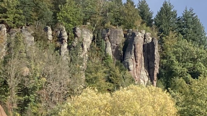 Erst ging es ganz gemächlich hinaus aus dem Kurgebiet von Herrenalb auf dem historischen Grenzweg zwischen Württemberg und Baden durch das Albtal bis nach Frauenalb – das Kloster wurde im 12. Jahrhundert von den Grafen Eberstein gegründet und diente als Stift für Töchter aus adeligen Familien. Im 19. Jahrhundert durch mehrere Feuer zerstört, steht heute leider nur nur noch die Klosteranlage als ausgebrannte Ruine, aber durchaus immer noch sehr imposant. Von hier aus ging es nun stetig bergauf nach Bernbach, einem Ortsteil von Herrenalb, auf einer Hochfläche gelegen. Die angepeilte Mittagspause fiel etwas kürzer aus als geplant, denn hier pfiff ein tüchtiger Wind. Wieder im geschützten und wunderschön herbstlich gefärbten Laubwald galt es nun die restlichen 250 Höhenmeter auf schmalen und steinigen Wegen zu erklimmen. Der Mauzenstein, nächster Anlaufpunkt unserer Wanderung, liegt als mächtiger Fels mitten im Wald – besonders auffällig die herauserodierten kreisförmigen Strukturen an der Felsoberfläche, die schon zu manchen Spekulationen Anlass gaben. Von hier war es nun nicht mehr weit zum ebenfalls auf knapp 700m Höhe gelegenen Bernsteinfels. Von seiner Aussichtsplattform hatte man gute Sicht auf Murg- und Rheintal und sich den fälligen Gipfelschnaps redlich verdient! Als letzte Station wurden noch die spektakulären Falkenfelsen oberhalb von Herrenalb angesteuert, bevor die Gruppe im Lokal „Zur alten Post“ einen schönen Wandertag ausklingen ließ.