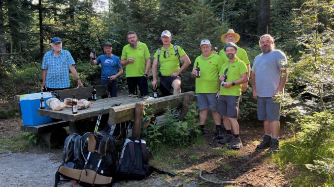 Unter dem Motto „Heute beginnt der Rest Deines Lebens“ konnten die Männer der Herrenwanderung mit Jochen Hauser als Wanderführer ein sowohl erlebnisreiches wie unterhaltsames Wochenende verbringen. Am Bahnhof Achern trafen sich sieben Wanderer um nach einer ersten kühlenden Stärkung mit dem Bus zur B 500 an die Haltestelle Kaltenbrunnen zu fahren. Hier wartete schon Helmut Hauser zum Mitwandern und …. mit einer Kiste Erfrischung und leckeren Brezeln. Nachdem sich alle gestärkt hatten, wurde die Strecke zum Hohfelsen bezwungen und das Gipfelkreuz besucht. Erfrischend war die Abkühlung im Hohfelsen-Brunnen, labend war der Gipfelschnaps.