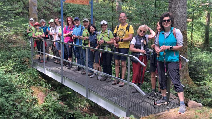 Am Sonntag den 18. Mai haben sich bei strahlendem Sonnenschein 19 motivierte Wanderer, darunter 4 Gäste auf den Weg rund um Oppenau gemacht. Tolle Aussichten, gute Gespräche und beste Stimmung – so macht Wandern richtig Spaß! Nach diesem Motto ging es an der Bimmerle Halle in Oppenau los. Über die Lierbachbrücke talabwärts am Lierbach entlang bis zum Pfarrhaus. Am schönen Stadtpark vorbei und weiter an Farnhöfen bis die Gruppe einen tollen Blick über Oppenau erhaschte. Nach einer kurzen Trinkpause erreichte man die Renchbrücke. Weiter zum Schellenberg und der Verein folgte nun der Route des Renchtalsteigs. Knackige Höhen mussten bewältigt werden, dann wieder abwärts Richtung Hölle. Nach dem Forstweg wanderten die SWV-Mitglieder zu einer schönen Brücke am Bühlbächle. Die Rast am Guckinsdorf Platz lud mit einem mitgebrachten Vesper und einem traumhaften Blick zum Verweilen ein. Gestärkt durch einen selbstgemachten, leckerem Erdbeer-Limes von der Wanderführerin Andrea ging es nun flott in Richtung Waldkindergarten. Von weitem war der Buchkopfturm zu erkennen, der leider seit letztem Jahr gesperrt ist. Am Lehwaldbrunnen, welcher vom Schwarzwaldverein erbaut wurde und auch eine schöne Rastmöglichkeit bietet, hielt die Gruppe nur kurz an, denn ein steiler Wiesenweg stand bevor, hinauf zum Boxberg. Da kamen schon manche ins schnaufen. Wurden dann anschließend mit einem schattigen Waldweg belohnt. Bei der Firma Fahrzeugbau Doll erklärte der Gastwanderer der Gruppe Interessantes über die Technik, Innovation und die Bedeutung des Unternehmens für die Region. Leicht ansteigend ging es auf schmalen Waldpfaden weiter zum Rebbergköpfle und zum Kinderpfad “Rosi Rotkehlchen“ und weiter über die Kleinebene. An der Friedenseiche (1871 gepflanzt) hatte man wieder eine tollen Aussicht, die Schwindelfreien waren im Vorteil, da ging es ganz schön bergab. Der letzte tolle Ort war die Kletthütte, die 1908 erbaut wurde, als markantes Symbol für den Luftkutort Oppenau. Der Namensgeber Philipp Klett war Lehrer in Oppenau, Dirigent des Sängerbundes und Ehrenbürger der Stadt. Leider starb er kurz vor der Einweihung. Jetzt mussten noch 115 Stufen abwärts überwunden werden bis zum Ausgangspunkt. Claudia bedankte sich herzlich bei der Wanderführerin für die 14 km und 500 Hm Tour. Der rundum schöne Tag klang bei einem wohlverdienten und köstliche Essen in einer Wirtschaft in Ramsbach gemütlich aus.