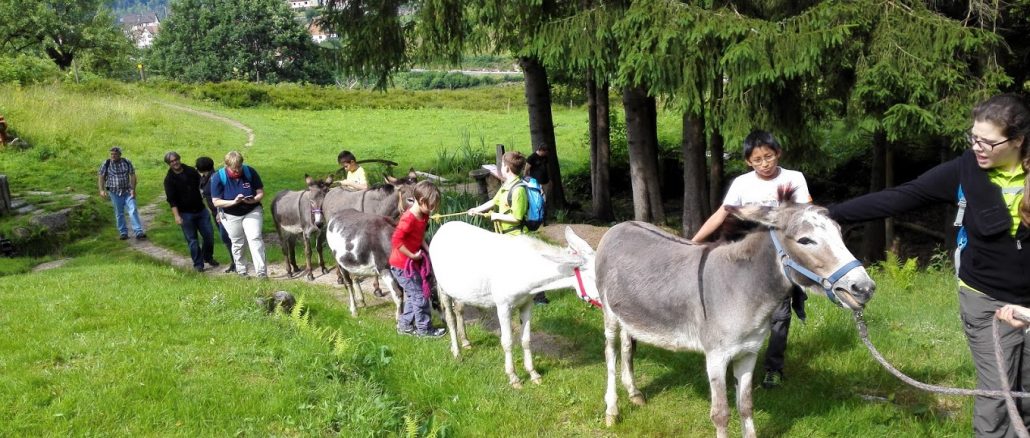 Es war ein Novum bei uns im Schwarzwaldverein. Eine Familienwanderung mit Eseln, 11 Stück an der Zahl. Und wie es der Zufall so wollte hatten wir heute auch 11 Kinder dabei.