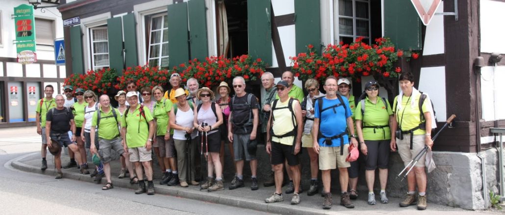 Auf dem weiteren Weg kamen wir am Sasbachwaldener Schwimmbad vorbei und schauten neidvoll den Schwimmbadbesuchern nach. Aber es ging weiter hoch unter der erbarmungslosen Sonne zur Weinkellerei Vierthaler, wo wir sehr freundlich empfangen wurden. Das Mittagessen mit herzhaften Häppchen, gefolgt von Kaffee und Kuchen, verlief fröhlich, und wir genossen die ausgedehnte Pause und den ausgezeichneten Wein in kühler Atmosphäre.