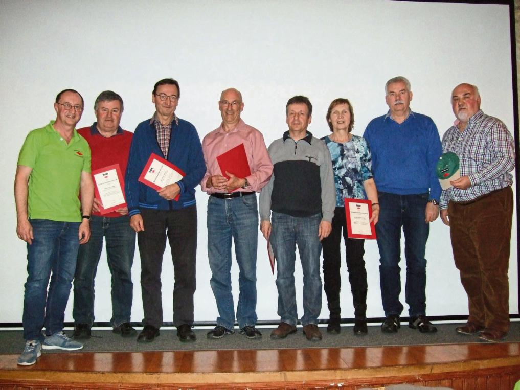 Jubiläumsmitglieder geehrt: Vorsitzender Albert Bohnert mit Josef Striebel, Herbert Schnurr, Reinhard Roth, Thomas Fallert, Brigitte und Karl Gerber (von links), rechts Bezirksvorsitzender Markus Mackert.
