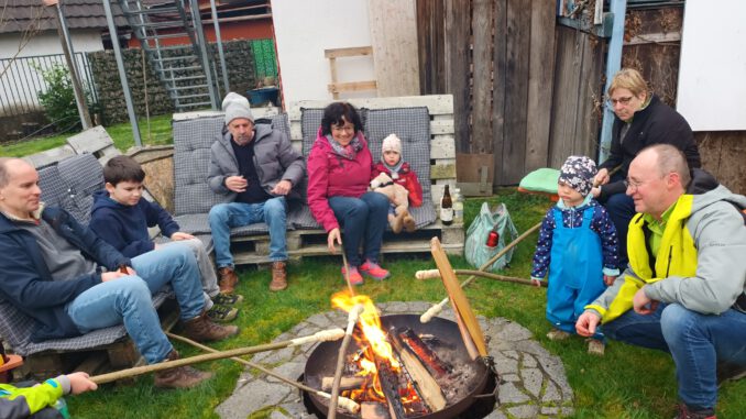 Unter diesem Motto trafen sich 6 Kinder, Eltern und einige Großeltern zu einer kurzweiligen Wanderung um Fautenbach. Zunächst führte der Weg dem Fautenbach entlang ins Oberdorf, vorbei an der alten Kirche, mit kurzer Erklärung von Albert, ging es weiter aus dem Ort hinaus. Auf den Wanderwegen, die Kinderwagen geeignet waren, führte der Weg weiter durch die Obstbäume bis zum Regenrückaltebecken. Das Rückhaltebecken schützt den Ort Fautenbach, bei Starkregenereignissen vor Überschwemmungen. Der weitere Weg führte über die Eselsgasse wieder zurück ins Oberdorf und somit auch wieder zurück in den Ortskern nach Hause zu den Wanderführern Albert und Matze. Dort wurde das Lagerfeuer und ein Feuerkorb entzündet. Die Teilnehmer hatten Ihr Grillgut dabei, Matze hatte Hefeteig für Stockbrot gerichtet so dass alle gleich beschäftigt waren. Zwischendurch wurde der Flammlachs am Feuerkorb angebracht, etwas ganz besonderes. Ja so verging ein wunderschöner Nachmittag der allen Spaß gemacht hat.