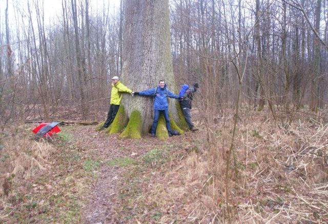 Durch das Stried wandernd erreichte man den imposanten Muckenschopfer Eichenkönig, bei dem es 3 Männer und 3 Frauen bedurfte um einen Ring um den mächtigen Stamm zu bilden. Bei der Bruchwaldhütte am Trimm dich Pfad von Muckenschopf gab es eine kleine Pause, bevor man wieder zum Ausgangspunkt der Tour an der Memprechtshofener Halle ankam. Der Vorsitzende des Schwarzwaldvereins Albert Bohnert dankte Reinhold Czasny für die Führung der Tour, und lud die Wanderer zu den nächsten Aktivitäten des Vereins ein.