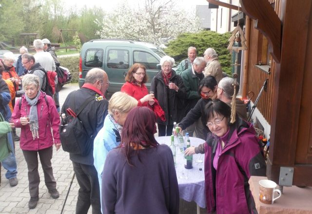 Die Wandergruppe setzte sich von der Dreikirschenhalle aus in Bewegung und wanderte zunächst durch Mösbach und konnte gleich die erste Attraktion, die Miniaturschlösser in Augenschein nehmen. Da an diesem Sonntag das Kirschblütenfest in Mösbach gefeiert wurde, konnten die Wanderer die Köstlichkeiten in den Hofläden genießen. Schweren Herzens setzte sich die rund 35 köpfige Wandergruppe in Bewegung durch die blühenden Bäume in Richtung Fautenbach, hier konnte das neue, fast fertiggestellte Regenrückhaltebecken besichtigt werden. Der weitere Weg führte die Wandergruppe durch Fautenbach, vorbei an der Ölmühle und der Alten Kirche, die heute als Konzertsaal benutzt wird. Der Weg über das Kriegerdenkmal eröffnete einen herrlichen Rundblick über Fautenbach, bevor man sich an einem Glas Wein beim ersten Vorsitzenden Albert Bohnert in der Ringstraße labte.