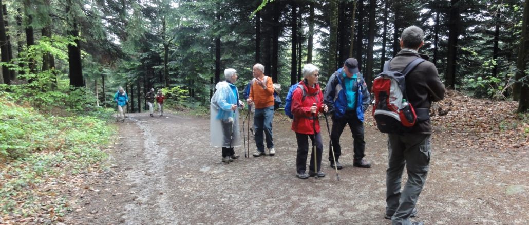 Über den Kohlplatz gelangten wir zum Niller Eck (645 m) und konnten im Hotel Nillhof gemütlich Kaffee und Kuchen ebenso wie eine herrliche Aussicht auf die umliegenden Höhen und Hohengeroldseck genießen, bevor wir auf einem Stück Jakobsweg den Rückweg nach Zell antraten. Der Weg führte uns zunächst durch einen Buchenwald, dann durch ein Erholungsgebiet am Waldrand, von dem aus ein Ausblick in das ehemalige freie Reichstal (1718) möglich war.