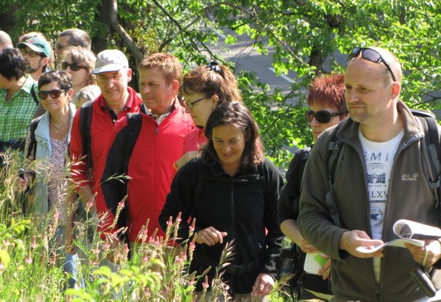 Weiter ging es zuerst über Kopfsteinpflaster und dann entlang der Straße zum nahegelegenen Naturschutzgebiet „Kugler Hang“. Nachdem uns Bruno anhand von Bildmaterial einige Orchideenarten gezeigt hatte, gingen wir auf dem sich schlängelnden Weg durch das Naturschutzgebiet. Dabei entdeckten wir viele herrliche Orchideenblüten wie das Helmknabenkraut, die Bocksriemenzunge oder die Dornige Hauheckel. Aber auch Hopfenklee, Büschelglockenblume und Kalkastern entgingen nicht unseren wachsamen Augen. Es war sehr beeindruckend durch die artenreiche Natur zu spazieren. Oben angekommen wurden wir mit einer wunderschönen Wildblumenwiese belohnt und allen war bei dem ansteigenden Weg warm geworden.