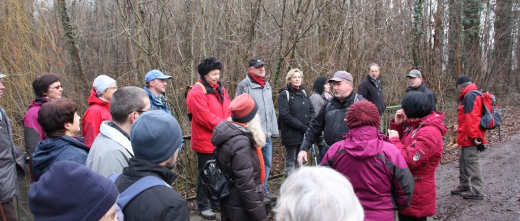 Dann gings zuerst ein kurzes Stück auf der Straße entlang, bald jedoch wurde in den Rheinauenwald abgebogen und auf dem Sommerdamm zum Groschenwasser marschiert. Zahlreiche Sehenswürdigkeiten gab es unterwegs zu bewundern, die dazugehörigen Erläuterungen gab es durch den Wanderführer, ergänzt durch Konrad Burkard, einem exzellenten Kenner der Region.