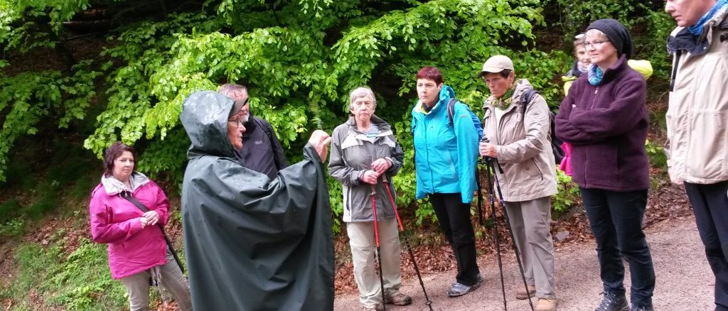 Mit ihrem beeindruckendem Wissen über alle möglichen Pflanzen entschädigte sie die 16 Teilnehmer dieser Tour für das sehr bescheidene Wetter an diesem Tag, und auch die Gertelbacher Wasserfälle zeigten ihre wilde Seite und stürzten brausend in die Tiefe. Zur Überraschung aller verteilte unsere Pflanzenexpertin noch zarte Fichtentriebe auf Schokoladenkurvete, und unser Franz Kurz und Wanderführer Reinhold Czasny Heilpflanzen auf Alkoholbasis, allgemein als Gipfelschnaps bekannt. Über den Briefträgerweg ging es eine verkürzte Strecke wieder nach Bühlertal, wo Frau Hartmann uns auf einem Quadratmeter Wiese unzählige verschiedene Wildpflanzen erklärte.