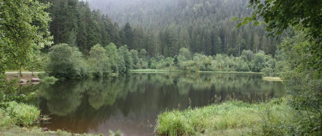 Dann machten wir uns bei trockenem Wetter auf einem wurzeligen, steinigen Pfad an der Saumkante der Karwand an den Abstieg zum nächsten Karsee: dem Ellbachsee. Die heute wegen ihres Moorwassers oft als „dunkle Augen“ bezeichneten Karseen haben ihren Ursprung in der Würmeiszeit, als sich kleine Hängegletscher tief in den Buntsandstein einhobelten und dabei die heute steilen Karwände schufen. Als die Gletscher schmolzen, füllte sich die Karmulde mit Wasser.