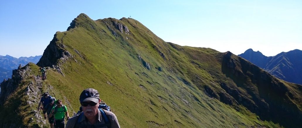 Zur diesjährigen Hochgebirgstour hatten sich bei Bergführer Franz Benkeser 9 Männlein und 2 Weiblein angemeldet. Der Termin und die Uhrzeit war fast allen klar, die Damen waren selbstverständlich pünktlich, ein Fahrzeugführer aus Weitenung hat dann auch im zweiten Anlauf den richtigen Parkplatz gefunden. Ein hochmotivierter Bergkamerad war mit seinem großvolumigen Motorrad schon am Vortag angereist. Dieser wartete dann allerdings ganz alleine an seinen vermeintlichen Startpunkt. Der Bergführer löste auch diese Herausforderung souverän in kürzester Zeit mittels neuester Kommunikationstechnik.